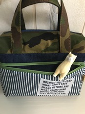 表地はヒッコリーストライプ、迷彩、デニムの綿の生地に接着芯を貼っています。