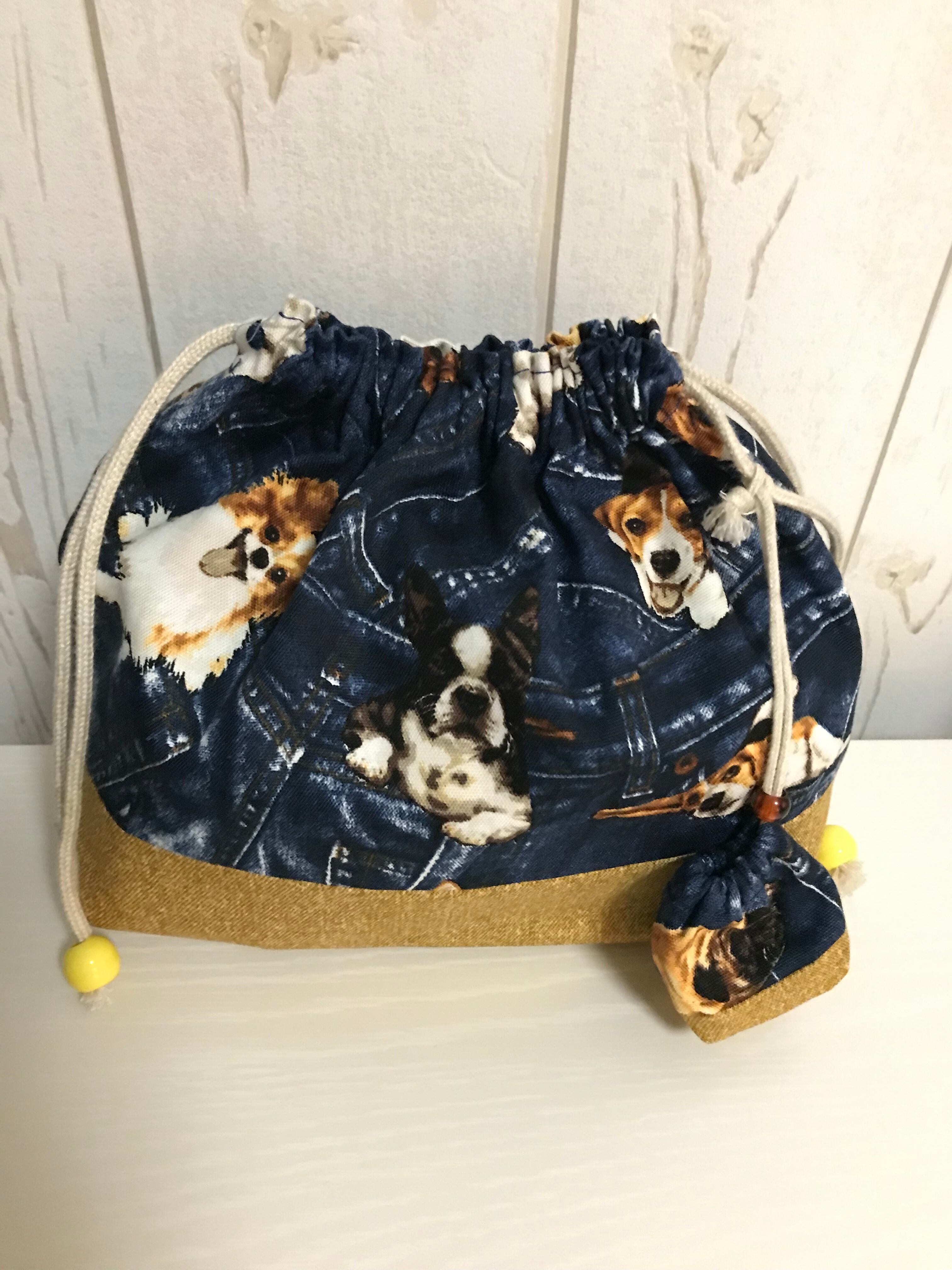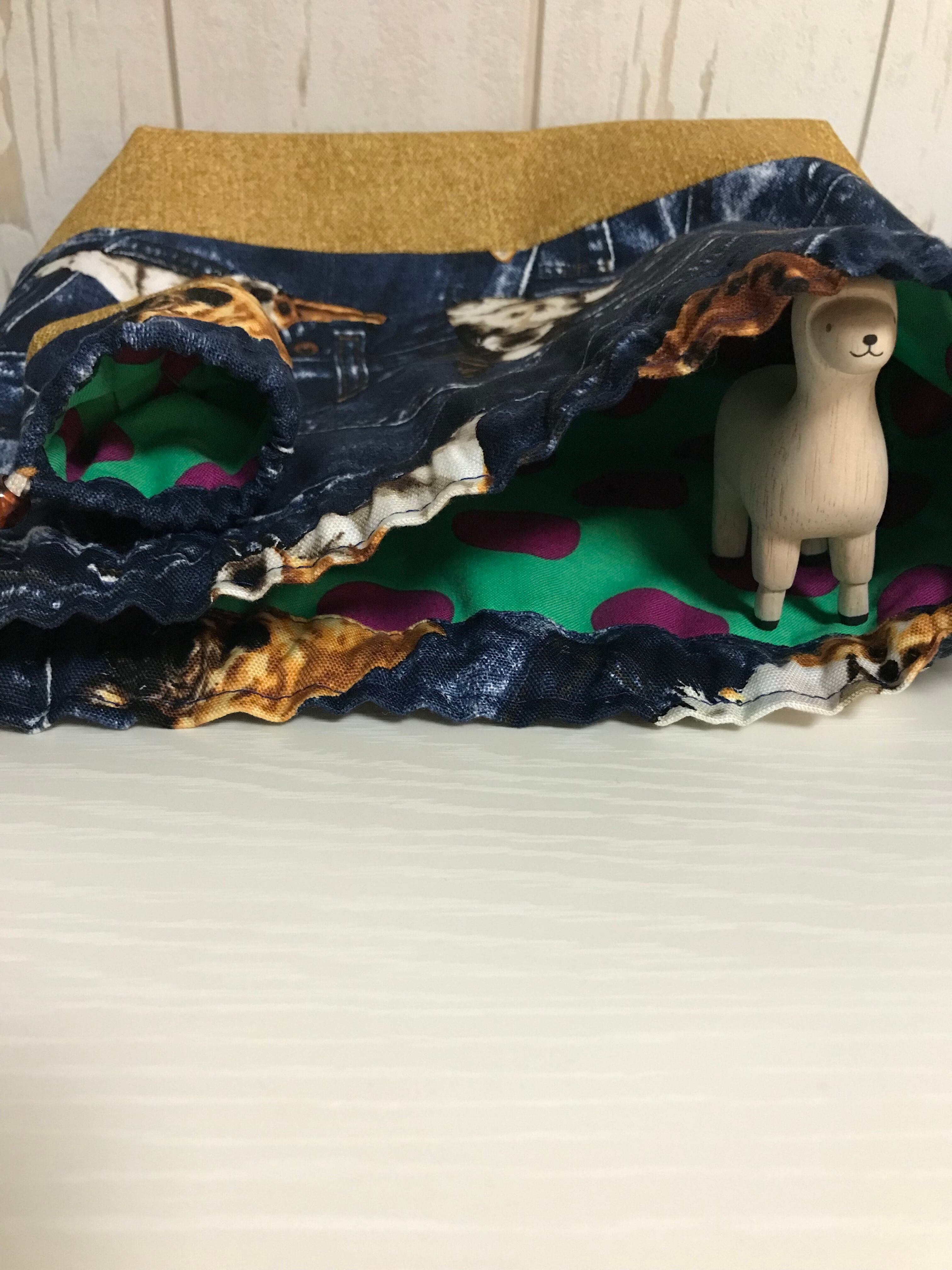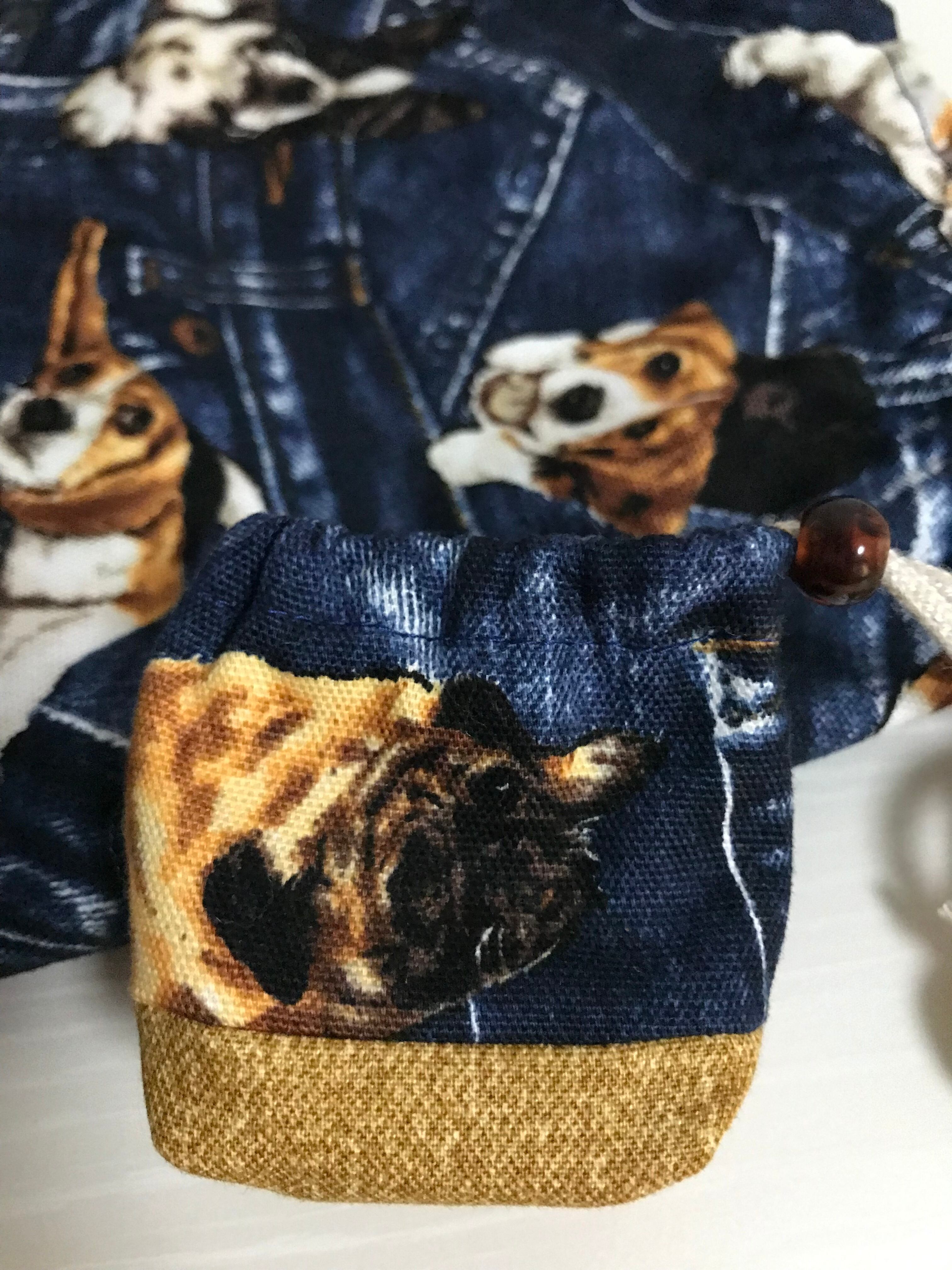 表地はデニムの上に犬が寝そべっている柄(うまく説明できずごめんなさい笑。可愛いワンコちゃん柄)と薄い茶系のコットン生地。