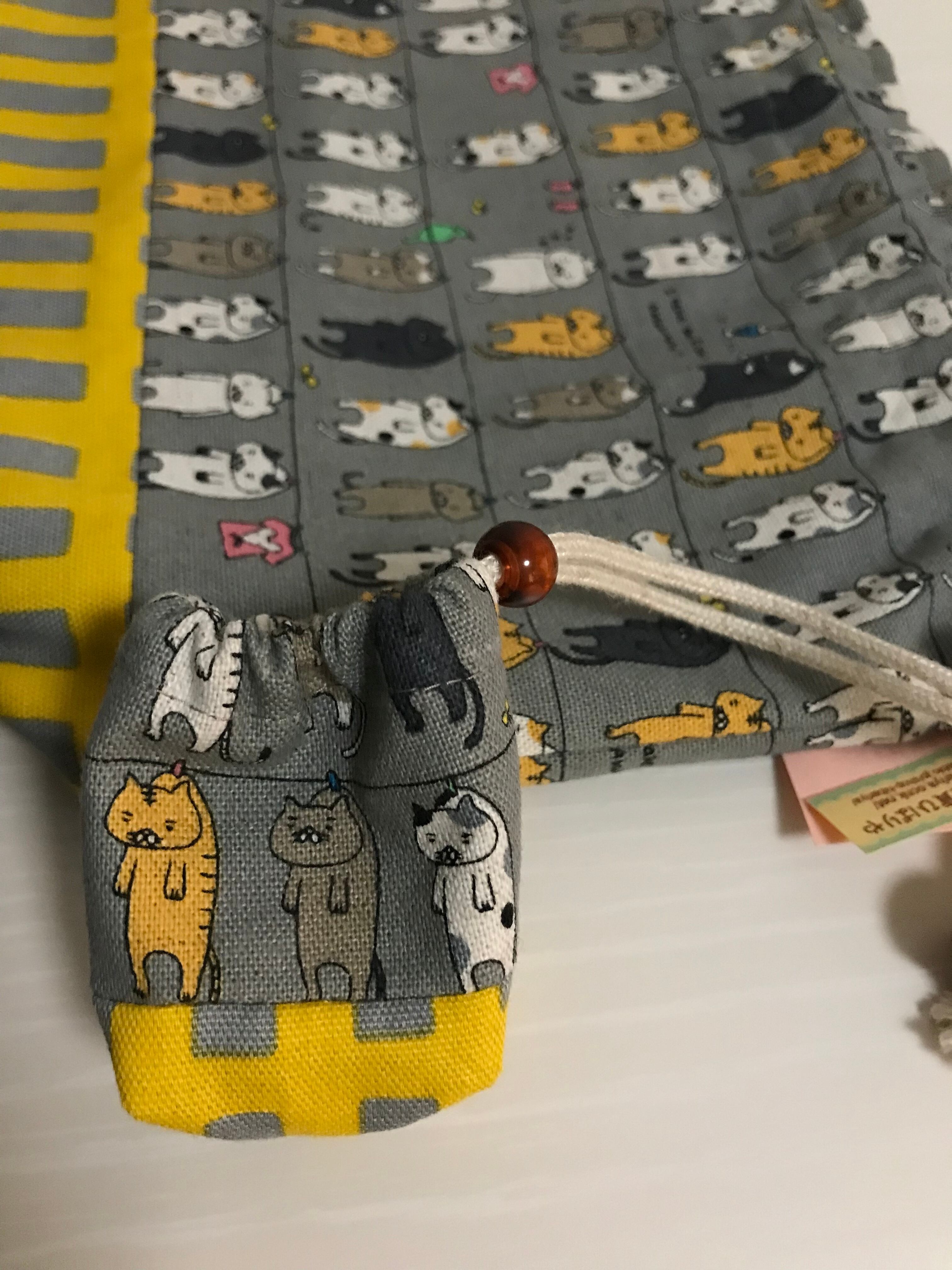 表地はお洗濯されたネコ柄と黄色とグレーの四角い柄?のコットン生地。