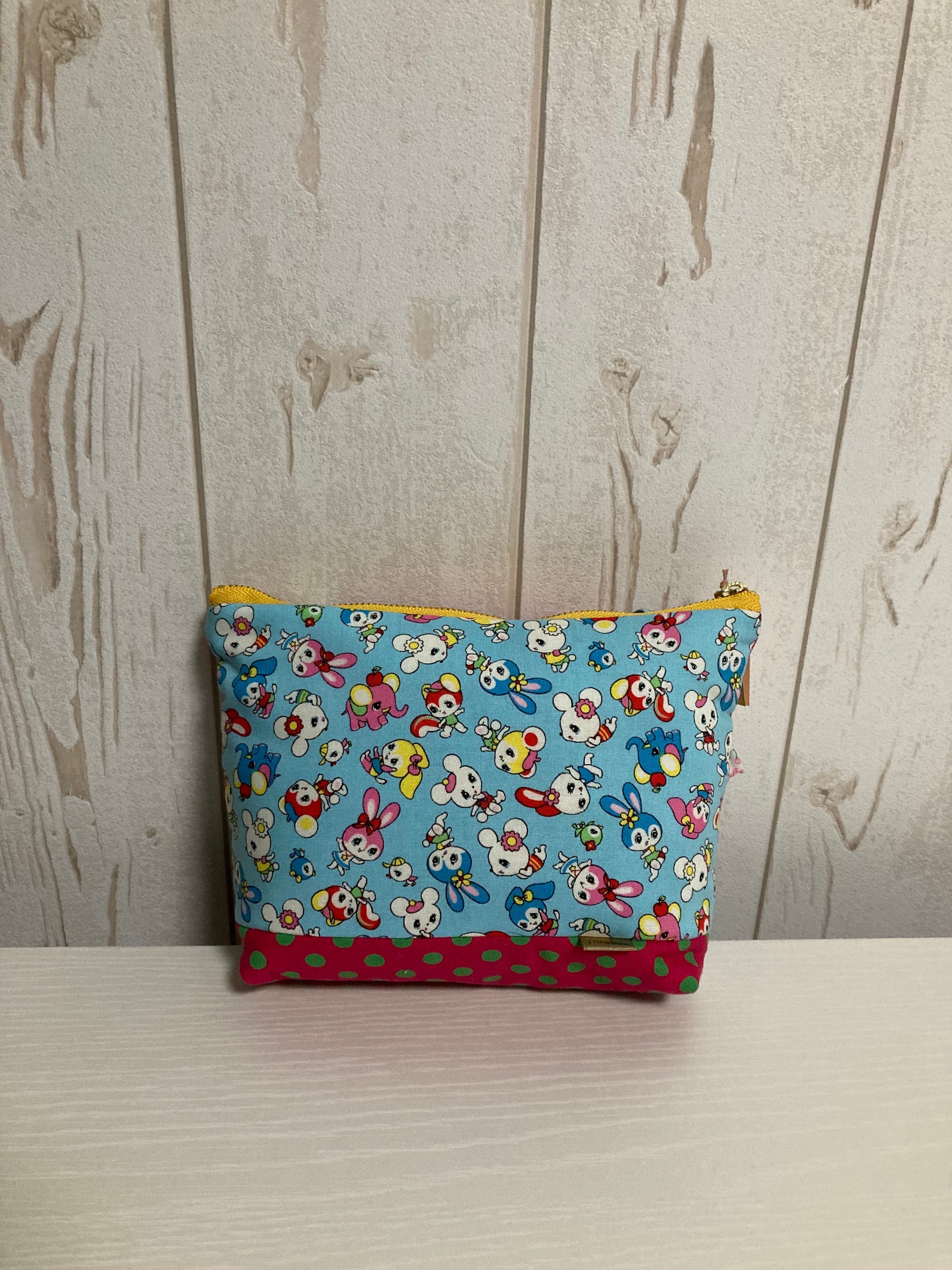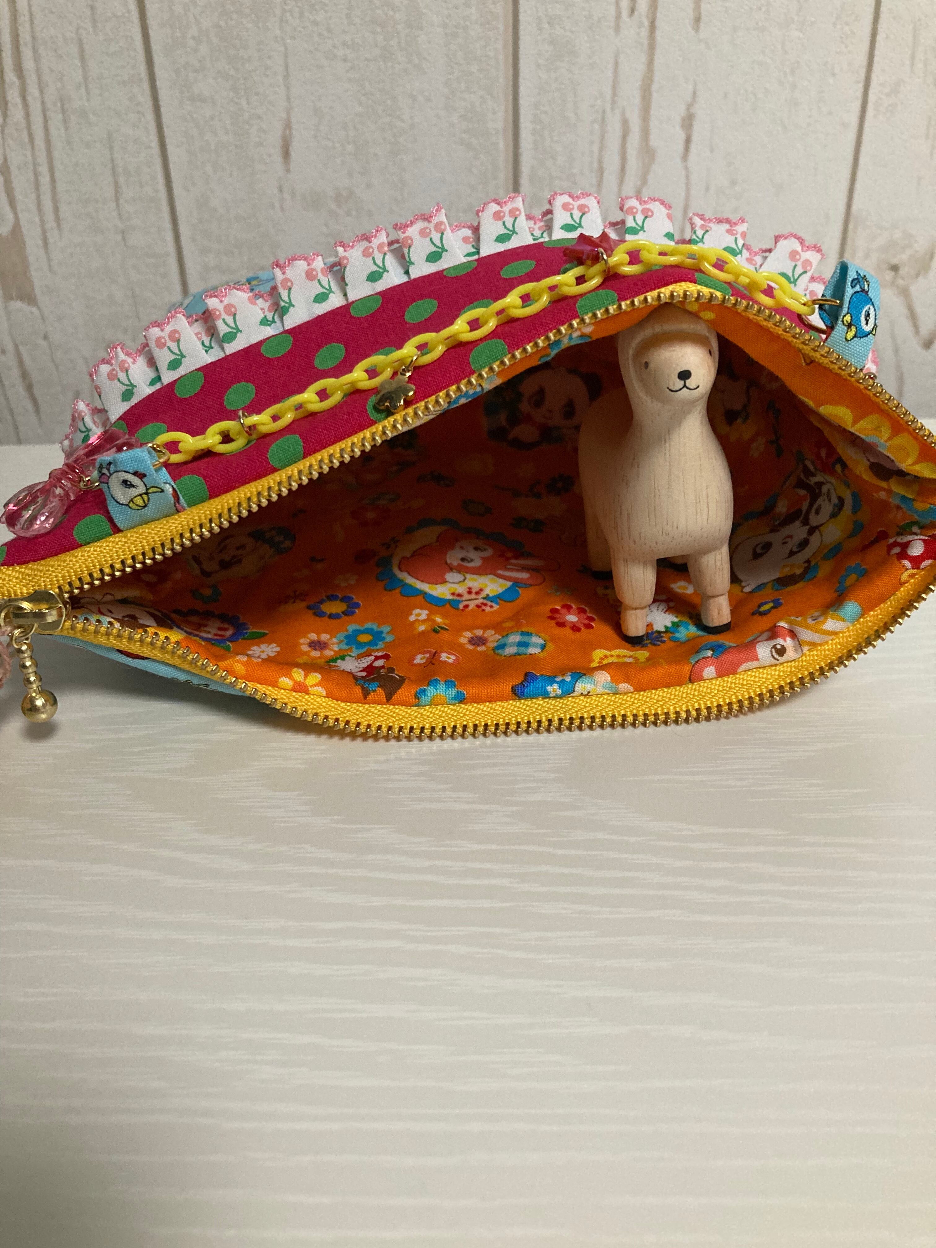 表地はハニーチューンのコットン生地とピンク色に緑のドット柄のコットン生地。